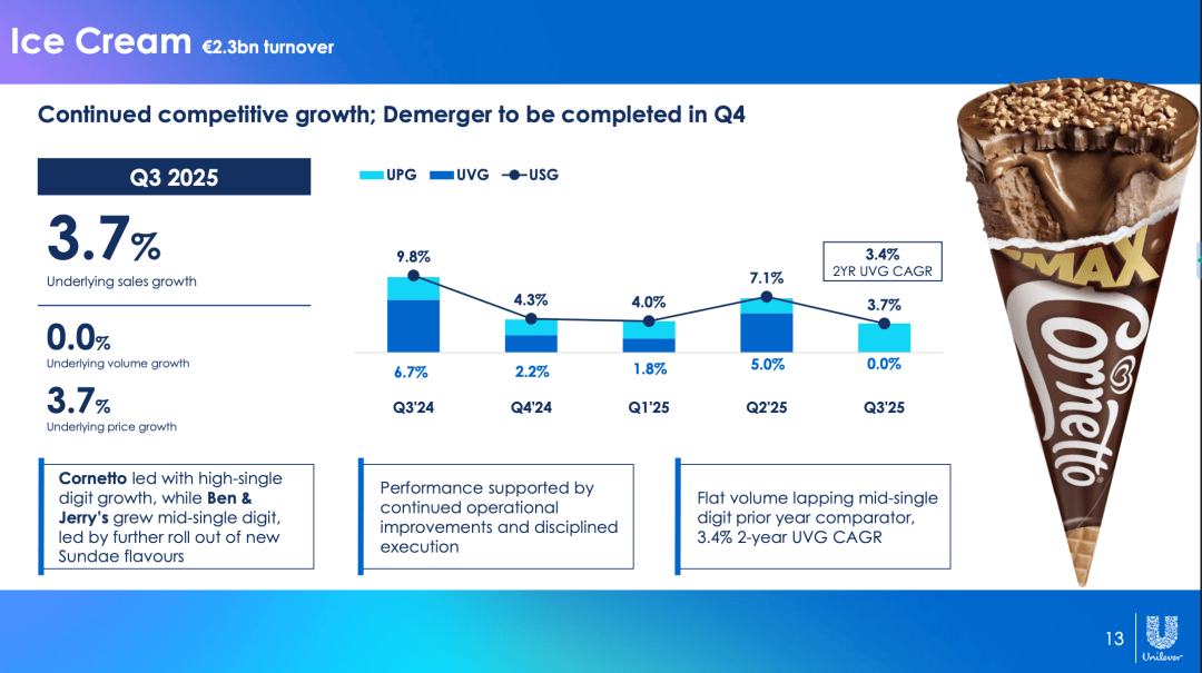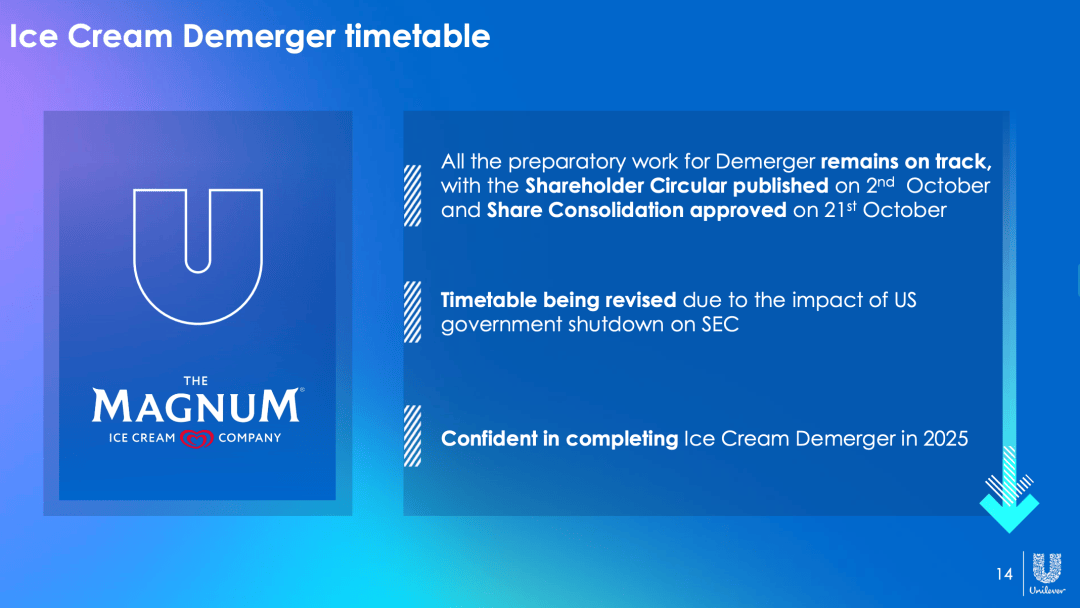 小食代介绍过,在第三季度,自7月1日起,冰淇淋业务已成为联合利华旗下的一家独立运营的公司:梦龙冰淇淋公司(The Magnum Ice Cream Company)。按照原计划,其将于2025年11月中旬完成从联合利华中拆分出来,并成为一家独立上市公司。