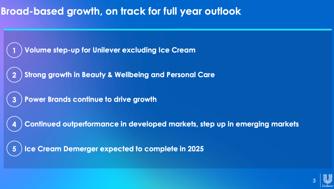 “所有业务集团均实现了广泛增长,这主要得益于我们强势品牌的推动。”Fernandez表示,“不包括冰淇淋业务在内,我们的业绩环比表现改善,销量增长加速。我们预计将于今年年底前完成冰淇淋业务的拆分。这将使联合利华更精简,业务更聚焦,利润率更高。”