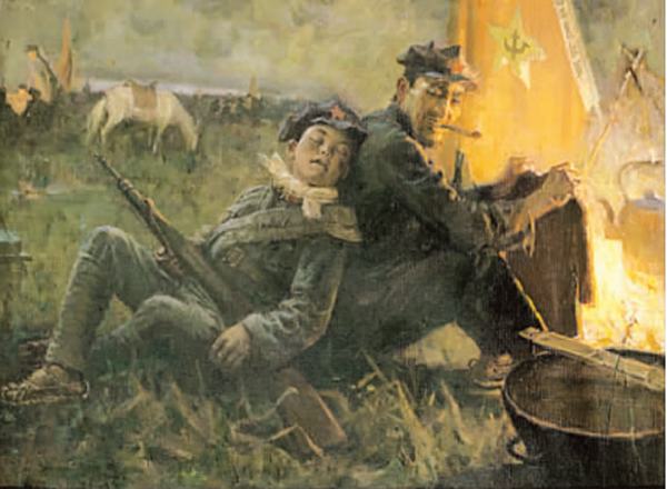 【油画《草地夜宿》孙滋溪作品,1979年】《草地夜宿》没有聚焦长征途中惊心动魄的历史性节点,不刻意渲染磅礴恢弘的场面,却以人性化的细节打动人心,给了观众无尽的遐想。